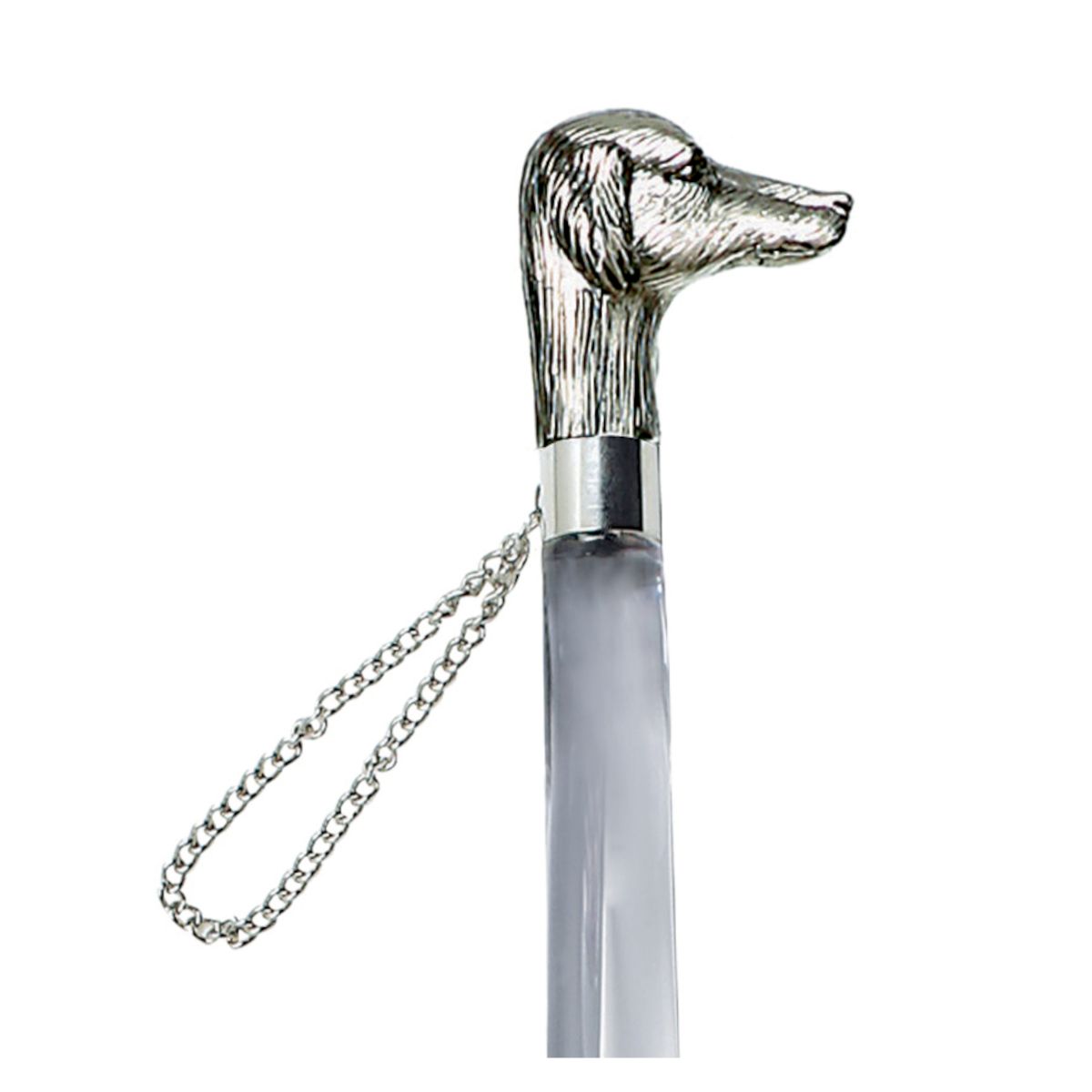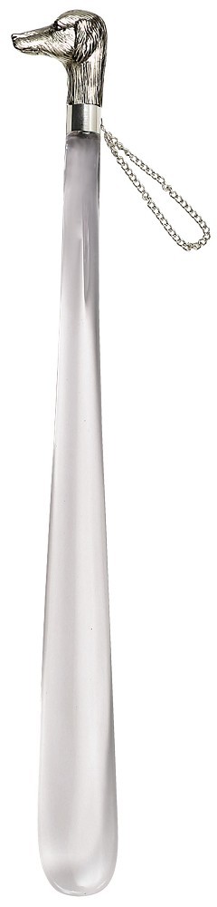 Ein Schuhlöffel, auch für Kinder mit einem Kopf im Hunde Design als Griff. Der Griff mit dem Hunde Kopf ist silberfarben, der Rest in modernem Transparent-Look.