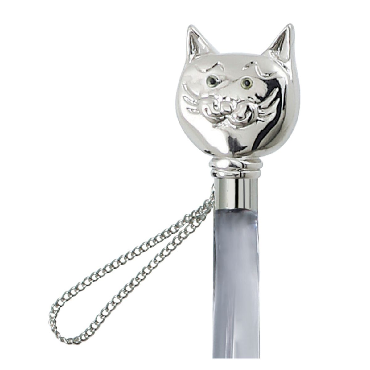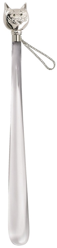 Ein Schuhlöffel, auch für Kinder mit einem Kopf im Katzen Design als Griff. Der Griff mit dem Katzen Kopf ist silberfarben, der Rest in modernem Transparent-Look.