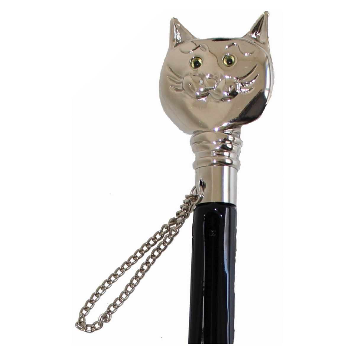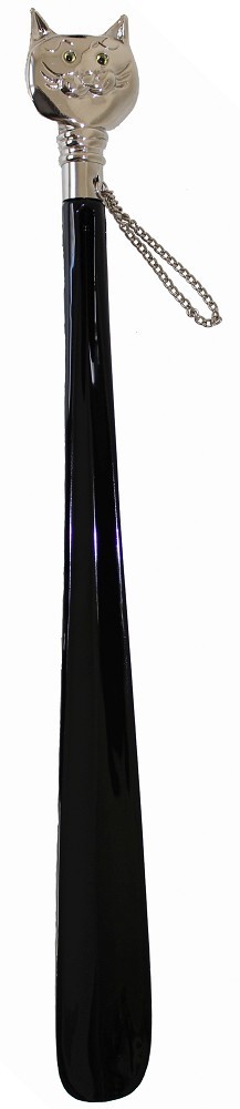 Ein Schuhlöffel, auch für Kinder mit einem Kopf im Katzen Design als Griff. Der Griff mit dem Katzen Kopf ist schwarz, ebenso wie der Löffel.