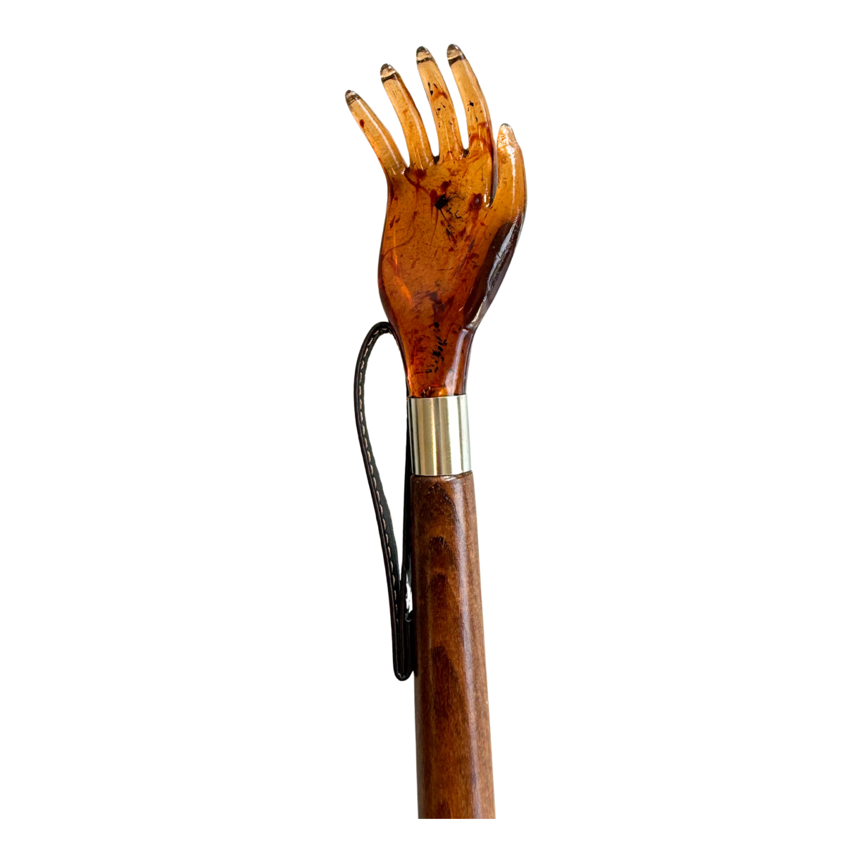 Ein Schuhlöffel, auch für Kinder mit dem Kopf einer Kratzhand. Der Griff mit der Kratzhand ist braun, das Holz ebenso.