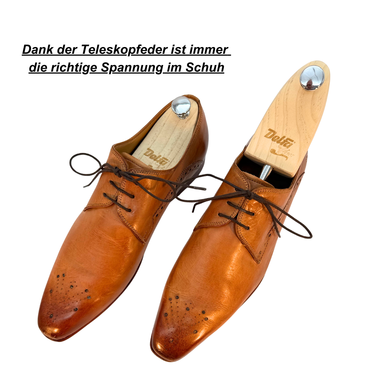 Die leichtgängige Teleskopfeder verbindet das Vorderblatt mit dem ausgeformten Fersenteil. Die Feder wird beim Aufleisten des Schuhs gespannt (komprimiert) und dehnt sich dann im Schuh sanft aus. Das Fersenteil schont dabei die Fersenkappe des Schuhs (keine punktuellen Druckspuren). Der Griff mit dem Knauf hilft beim problemlosen Einsetzen in und Entfernen aus dem Schuh.