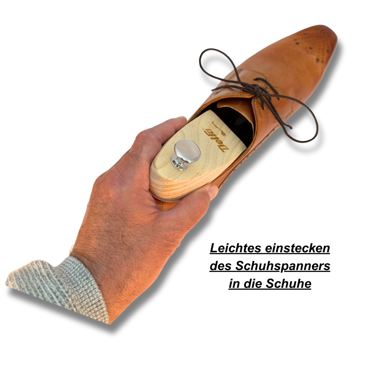 Der Schuhformer wird am besten direkt nach dem Tragen eingesetzt, solange der Schuh noch warm ist. Eventuelle Gehfalten oder eine Wölbung der Sohle werden dadurch stark vermindert. Das naturbelassene Holz nimmt die Feuchtigkeit vom Tragen der Schuhe optimal auf.