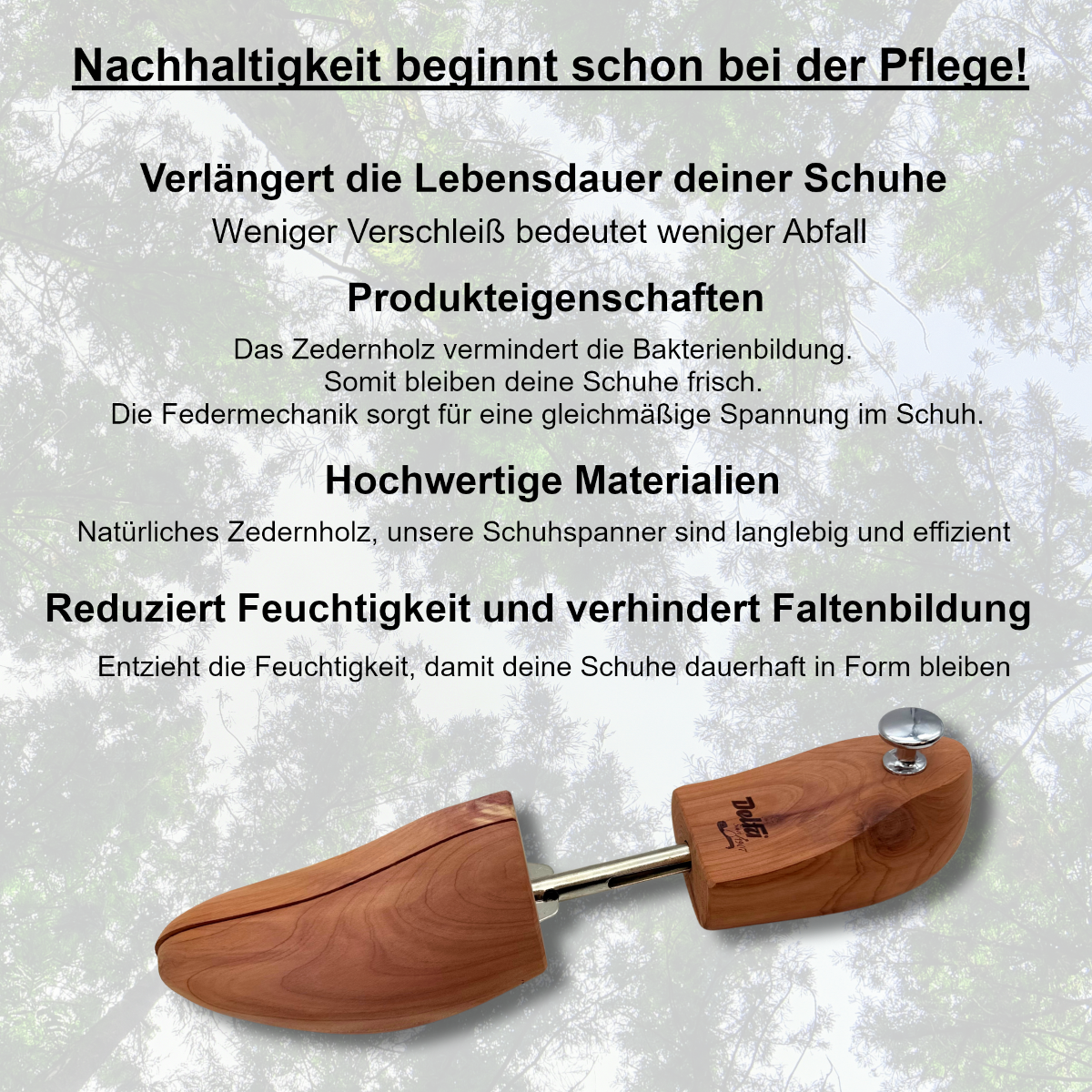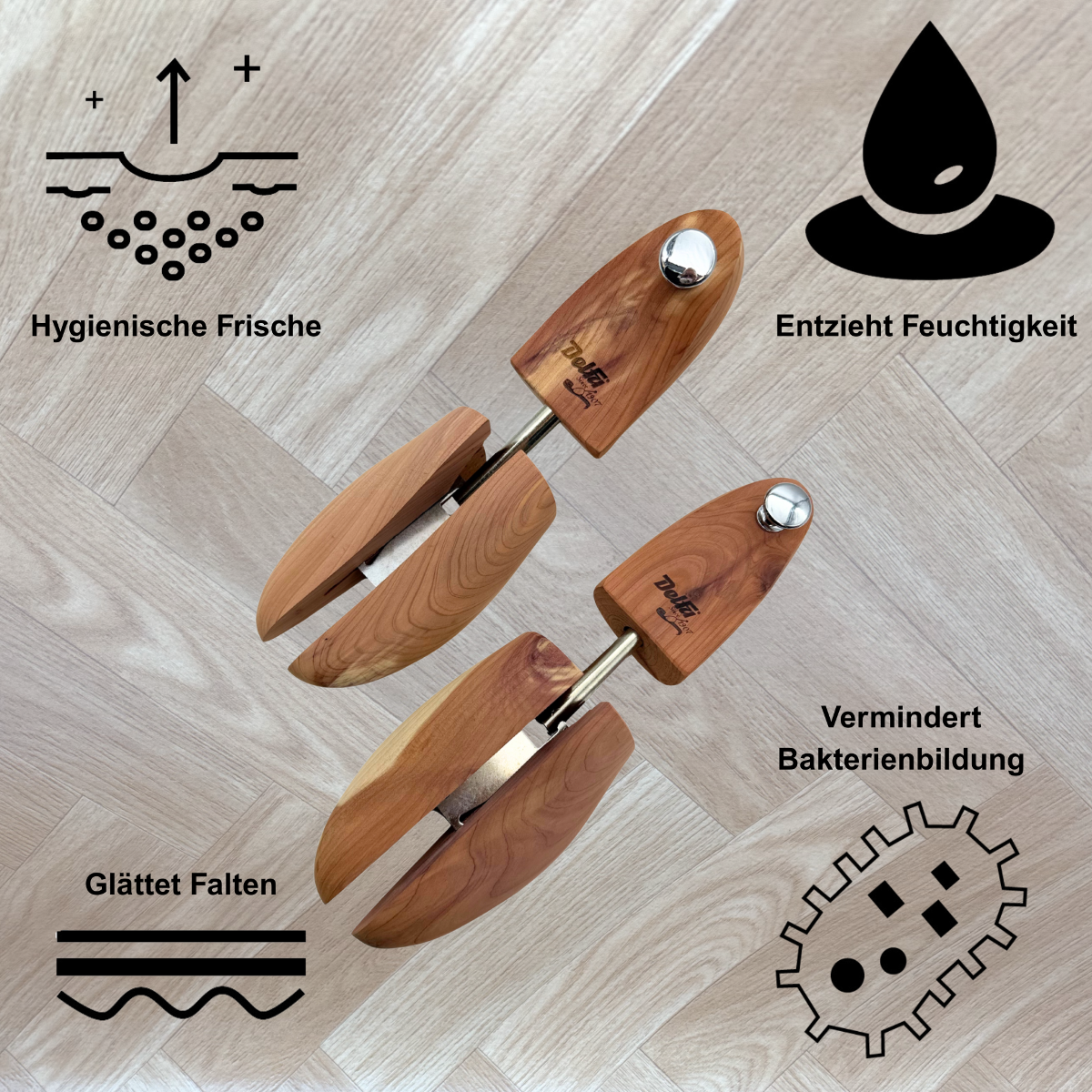 • AUFNAHME VON FEUCHTIGKEIT: Das Zedernholz der Schuhspanner sorgt für eine sehr gute Aufnahme von Feuchtigkeit, wodurch dem Schuh die Feuchtigkeit entzogen wird und dieser schneller trocknet.