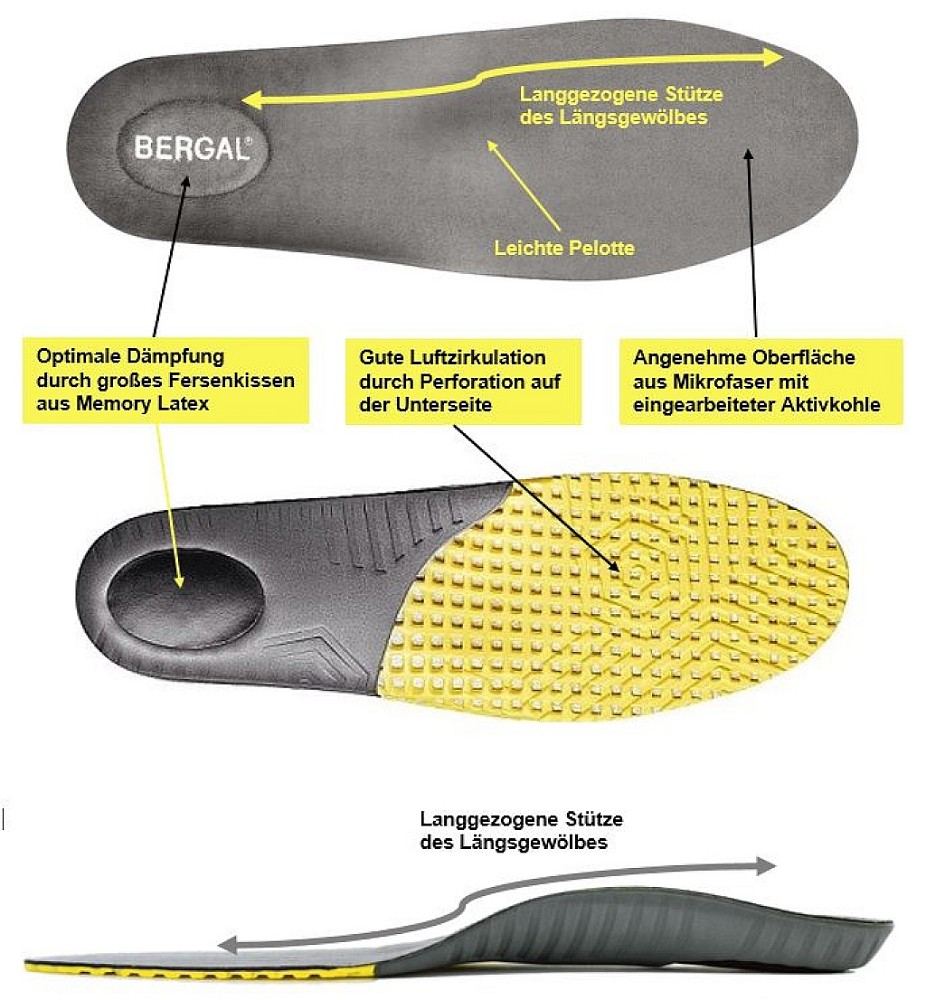 Bergal Daily Support vereint hochwertige, strapazierfähige Materialien zu einem funktionalen und komfortablen Fußbett für jeden Tag. Es bietet perfekte Torsionskontrolle und hohe Festigkeit sowie Stabilität des Fußes im Schuh. Die langgezogene Längsgewölbestützung sorgt für eine gleichmäßige Druckverteilung. Das Fersenkissen aus Memory Latex minimiert die Druckbelastung beim Aufprall der Ferse auf den Boden. Sehnen und Bänder werden dadurch entlastet und Gelenke geschont. Das Obermaterial leitet die Feuchtigkeit schnell vom Fuß weg und die verarbeitete Aktivkohle absorbiert in hohem Maße Fußgeruch und hält die Füße frisch. Das Fußbett ist geeignet für alle gängigen Schuhmodelle, sowie für Schuhe mit GORE-TEX©-Membran, GORE-TEX© Surround©-System, SympaTex©-Material oder anderen TEX-Materialien.
