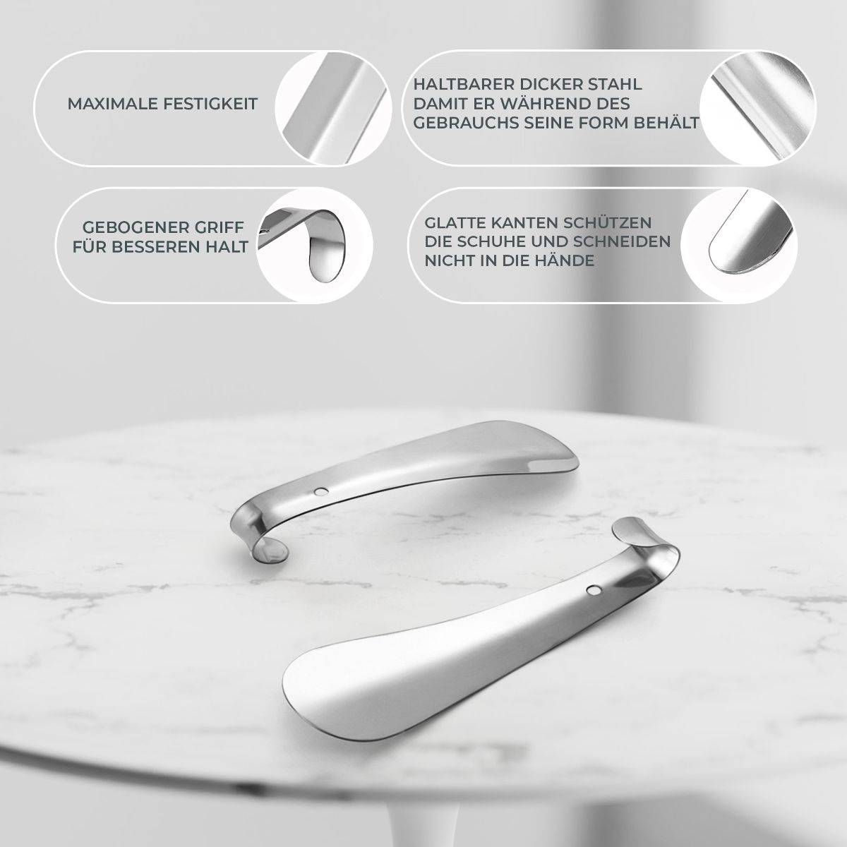 Aus gehärtetem Stahl gefertigt, dadurch wirkt er nicht nur sehr stabil und unbiegsam, er ist es auch. Obwohl der Schuhanzieher aus Metall hergestellt wird, liegt er sehr gut in der Hand.