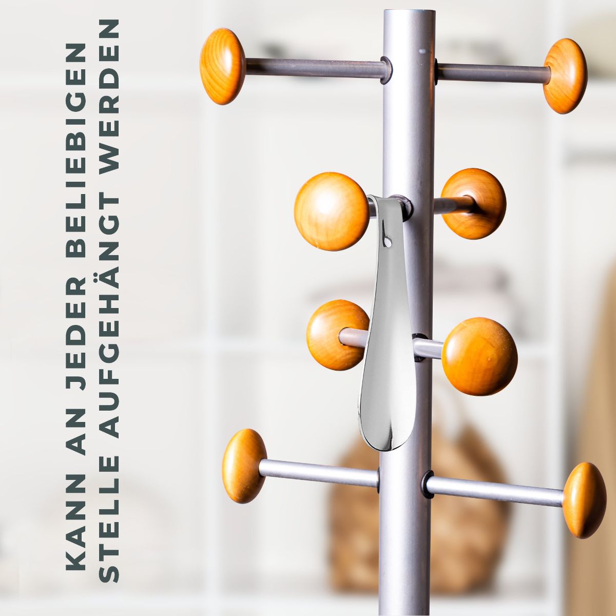 Am Griff des Schuhanziehers mit Haken ist zusätzlich ein kleines Loch angebracht. So kann der Schuhanzieher auch aufgehängt werden.